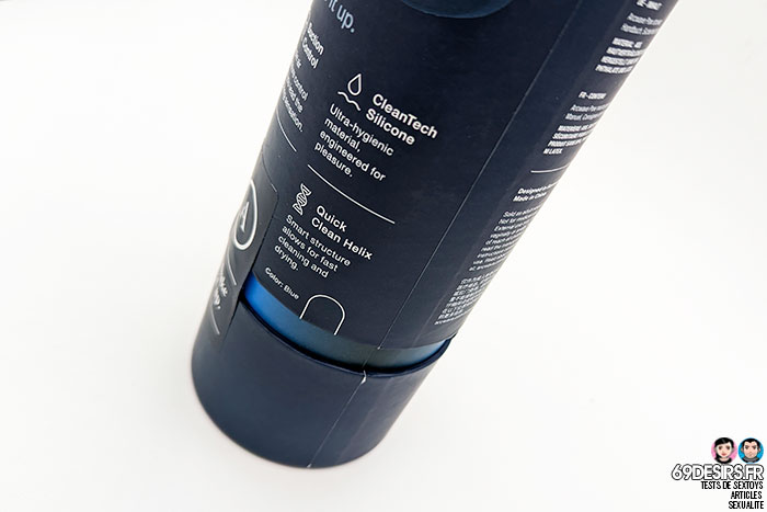Pour commencer, parlons de l’emballage de ce masturbateur. Comme vous pouvez le voir sur les images, il s’agit d’un tube cartonné, tout comme le Kyo Crystal Mouth par exemple, avec ici, le Pow en photo. On peut y voir une sorte de tourbillon bleu, qui pourrait nous laisser penser qu’il s’agit d’un système innovant d’air ou de ventilation. Vous verrez qu’en réalité, il n’y a pas de quoi tourbillonner. On retrouve sur ce tube, le nom de la marque « Arcwave », ainsi qu’une pastille qui nous indique « Soft CleanTech Silicone », le silicone spécifique qu’utilise Arcwave pour ses sextoys.