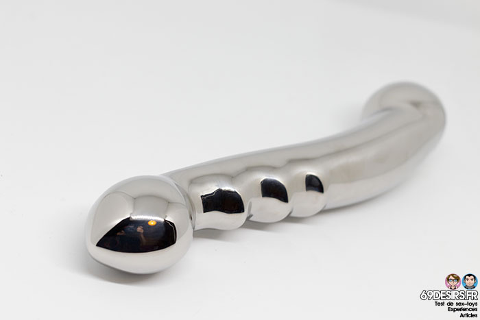 Chaque extrémité est différente. La tête la plus grosse, en forme de bulbe avec une partie bombée est clairement destinée à venir stimuler la prostate et la courbe est légèrement incurvée vers l’intérieur. Cette tête pourra poser problème chez certaines pour les va-et-vient si vous souhaitez stimuler votre point G, pour d’autres, ça sera le paradis. La plus petite tête est arrondie avec une partie plus plate.