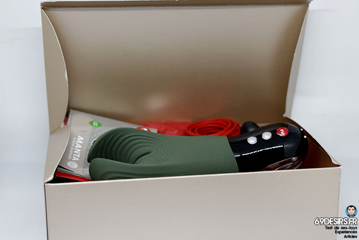C’est une boîte cartonnée, dans laquelle vous retrouverez le Manta de Fun Factory, mais aussi, un petit livret et un câble de chargement « Click’n Charge ». Bien entendu, aucune surprise dans cette boîte. Il n’y a toujours pas de plastique, ce qui est une bonne chose, mais toujours pas de pochette de rangement. Gardez la boîte pour stocker votre jouet.