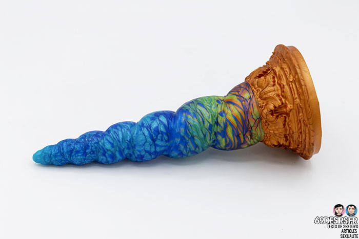 Le gode Fênra est donc un modèle en forme de corne de licorne ! On peut voir qu’il se compose d’une hampe tournoyante, mais aux bords doux, comparé à la version « intense », qui affiche des bords plus texturés et plus présents. La pénétration sera donc plus douce sur cette version que sur l’autre. On peur voit sur celui-ci, 6 torsades, qui forme la hampe de ce gode, avec de très beaux changements de coloris sur celle-ci, puis, un socle, que j’ai du mal à identifier, mais qui possède de nombreux détails !