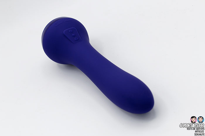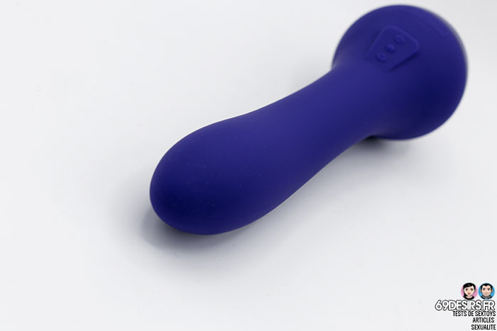 On peut également voir qu’une sorte de contour en plastique ABS est présent, au niveau de cette demi-sphère ainsi qu’une partie avec les commandes qui se composent de trois boutons. Nous avons aussi un tout petit trou pour brancher le câble de chargement et un petit logo. C’est vraiment un drôle de sextoy, une curiosité qu’on a envie d’essayer car c’est vraiment inhabituel !