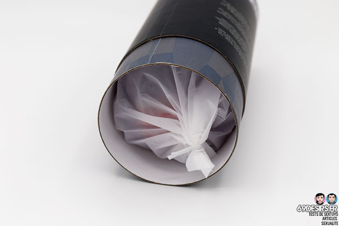 Quand on ouvre cette boîte, on découvre le masturbateur entouré dans une poche de type sac à légumes, c’est une bonne chose pour l’écologie. On retrouve quelques informations sur la boîte cylindrique, mais il n’y a rien de plus.