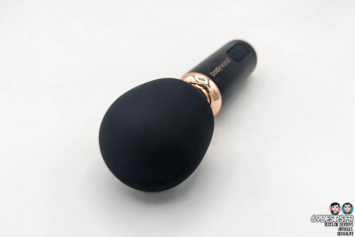 Visuellement, la Lolly Wand est gracieuse et luxueuse ! En effet, nous avons une petite wand, noire et dorée, avec un manche assez fin, qui contient le logo « Bodywand » légèrement doré, puis à côté, une zone de contrôle en silicone qui contient trois boutons, un bouton « + », un bouton « – » et un bouton « Power » en forme de petite bosse.