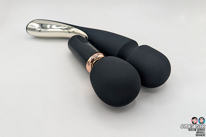 À l’extrémité de la wand, du côté du manche, nous avons deux points magnétiques afin de venir clipser le câble de chargement pour recharger sa batterie interne. Juste avant le cou en accordéon assez fin, nous avons un cerclage doré, presque « rose gold ». Et enfin, nous avons une large tête, en silicone noire, mais qui n’est pas détachable. N’essayez pas de le faire, car on peut voir que la tête reste tout de même collée, ce n’est pas fait pour cela.