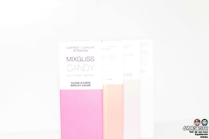Le packaging des lubrifiants MixGliss est une boîte cartonnée. Il s’agit de carton blanc avec une touche de couleur suivant le parfum choisi. Chaque packaging fait écho à l’autre pour former la collection entière. C’est un bon choix, j’aime bien. On retrouve quelques informations au sujet produit sur l’emballage, c’est assez classique.