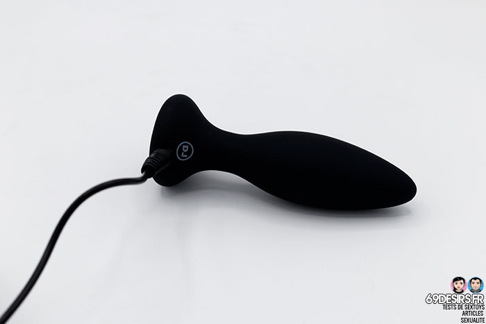 Pour vous décrire ce plug, je peux déjà vous dire qu’il possède une forme assez fine et longue ! C’est un plug pour débutants, c’est déjà un bon point. En effet, il est de forme conique et arrondie, ce qui facilite l’insertion dans l’anus. On peut voir qu’il possède un bouton « Power » à la base de ce dernier, au niveau du frein. Vous avez aussi un emplacement pour le chargement du plug.