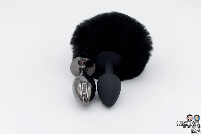 Un plug en forme de queue de lapin ? C’est à peu près cela ! Sauf qu’ici, le lapin est noir ! De plus, ce plug me fait penser au plug Fonfon le Courtisan de Passage du Désir que vous avez pu peut-être voir sur le site ! C’est un petit plug de forme classique, comme un plug rosebuds, en ogive, avec un pompon au niveau du frein ! Le pompon n’est pas énorme, juste ce qu’il faut pour avoir une queue de lapin qui habille notre anus ! Après, il vous restera à trouver la carotte ! Il semblerait que la partie « pompon » soit collée au frein, j’ai tiré un peu dessus, c’est tout de même résistant. Cette partie ne devrait pas se décoller comme ça.