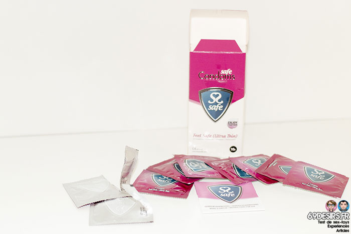 Que dire ? C’est une boîte de préservatifs, voilà, on passe à la suite ! Non, soyons tout de même pro ! D’une part, Safe Condoms propose plusieurs préservatifs dans leur gamme. La première qu’on vous propose, c’est la gamme Ultra Thin, teintée de rose avec la mention « Feel Safe » dessus. J’aime bien les systèmes de repérages couleur, je trouve que c’est plus rapide à trouver dans les rayons et ça garde une certaine homogénéité dans la gamme.