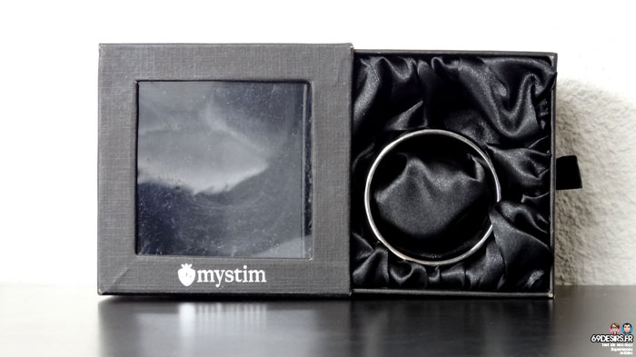 À l’intérieur, le cockring Mystim Earl est entreposé sur du tissu noir, c’est plutôt classe et je dois dire que j’aime bien ce packaging. Il permet de mettre en valeur l’objet et en plus, le conserver à terme.