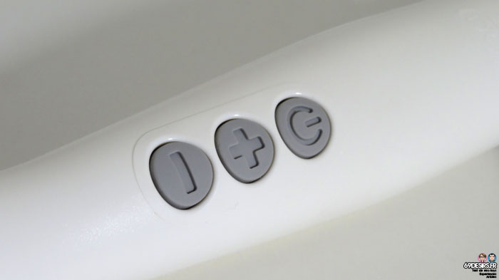On retrouve sur le manche trois énormes boutons ronds, impossible de les louper même perturbée, à deux doigts de l’implosion ! Un bouton marche/arrêt, un « + » et un « -« . Élémentaire, mon cher Watson !