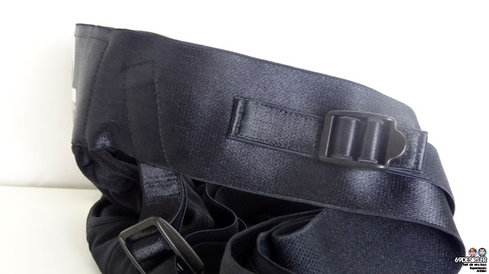 Pour l’enfiler, c’est très simple, même si j’avais un peu peur au début. Il suffit de passer une première jambe au niveau de la première lanière, puis la seconde jambe. On remonte le harnais, on se débrouille pour faire passer son pénis dans la poche adéquate, on sert la taille avec la ceinture en velcro puis on tire sur les languettes présentes sur les côtés pour serrer correctement le harnais et pouf, c’est magique, ça tient super bien en place !