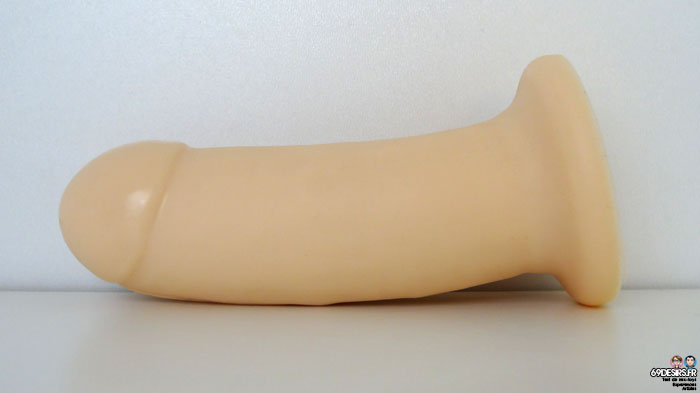 Ce pénis tient droit sur une base plate, il mesure 14,5 cm de long pour une longueur insérable de 13 cm je vous l’ai dit c’est court. Le gland a un diamètre de 4,30 cm, le milieu de la hampe a un diamètre de 4,50 cm et la partie « basse » à un diamètre de 4,70 cm. C’est assez rare d’avoir un diamètre évolutif sur les godes réalistes, généralement le gland a le diamètre le plus important, comme sur les hommes d’ailleurs.
