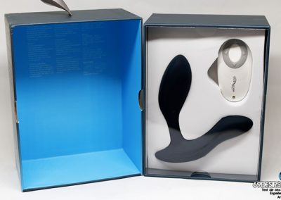 Encore une fois, We-Vibe utilise le même type de packaging que pour ses précédents produits. Nous avons le droit à une boîte rectangulaire, utilisant du noire et du bleu néon pour le Vector. On retrouve sur le devant, le masseur prostatique et derrière ainsi que sur les tranches, des informations sur le produit. Sur la partie haute, une languette se situe, permettant de soulever le couvercle.